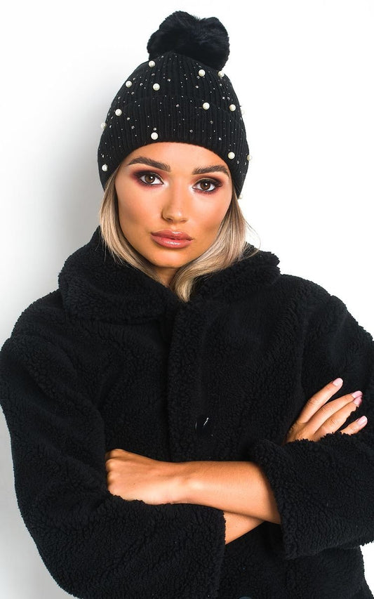She Wears Glory™ Pom Pom Knitted Winter Hat With Pearl Decor