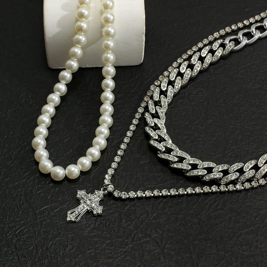 Trendy and fashionable pearls with Cuban chain and cross-studded diamond multi-layer design versatile necklace