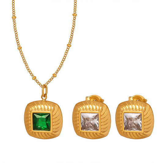 18K Gold Fashionable Retro Square Inlaid Gem Design Court Style Earrings Necklace Set