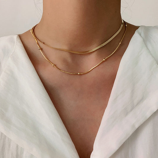 18K Gold Light Luxury Fashion Blade Chain with Golden Bean Snake Bone Chain Double-layer Design Simple Style Necklace