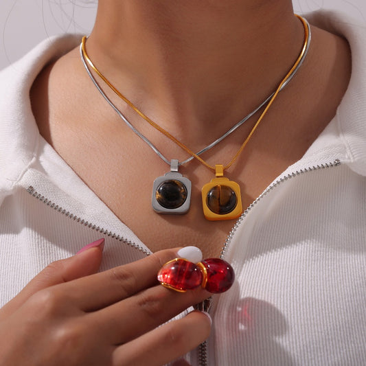 18K gold classic fashionable square plate inlaid gemstone design versatile necklace