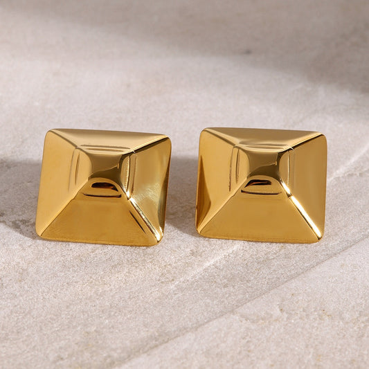 18K gold simple and elegant square with tower-shaped convex design earrings