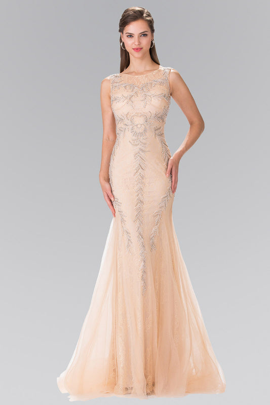 She Wears Glory™ 3-D Flower Jewel Sheer Corset Bodice Mesh A-line Long Dress