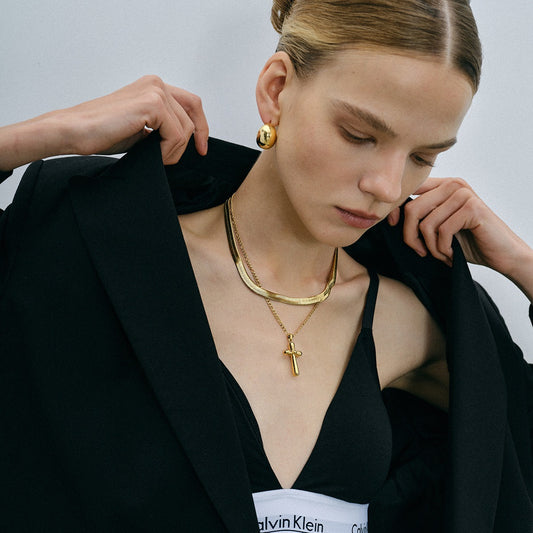 18K gold noble and elegant lines cross design simple style necklace bracelet set