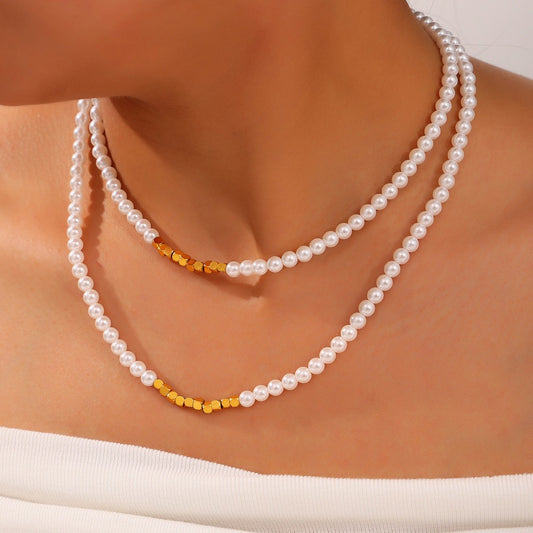 18K gold fashionable simple pearl beads with irregular small square design necklace