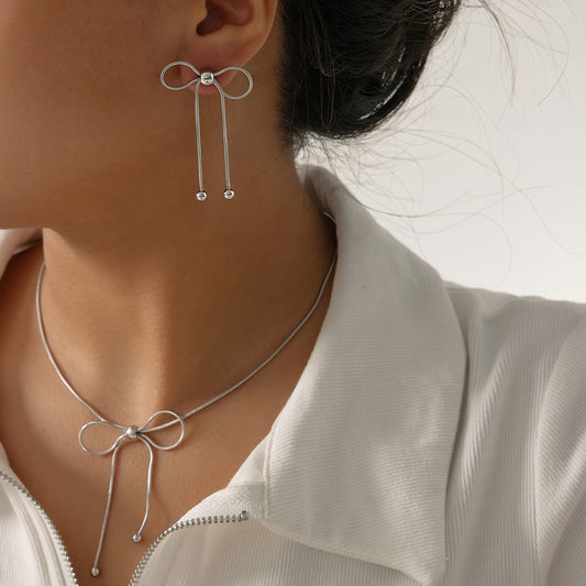 18K gold fashion simple bow design light luxury style necklace and earrings set