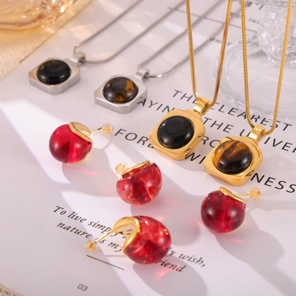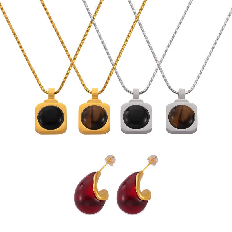 18K gold classic fashion teardrop-shaped/square inlaid round gemstone design earrings and necklace set