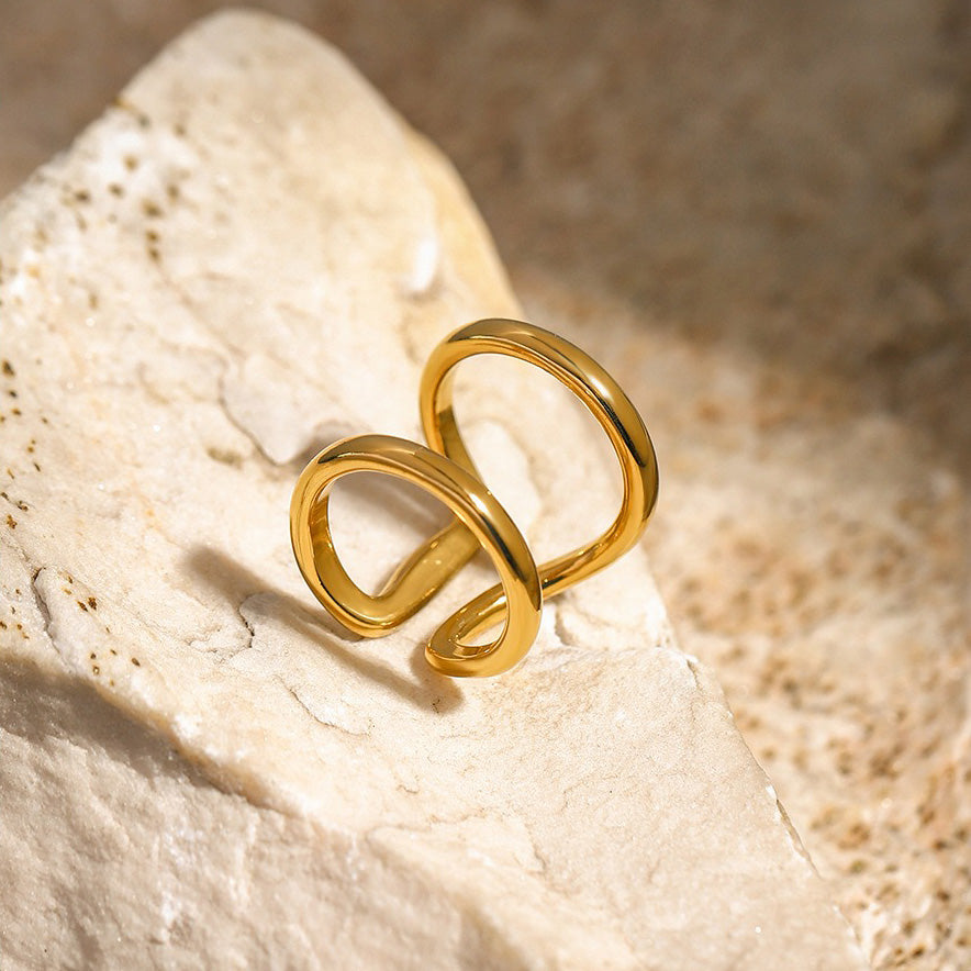 This ring features an exaggerated line design and is made of high-quality 18K gold. It is simple but not without personality, presenting a fashionable and simple style. The opening design of the double-layer line is creative, showing a unique sense of design and unique charm.