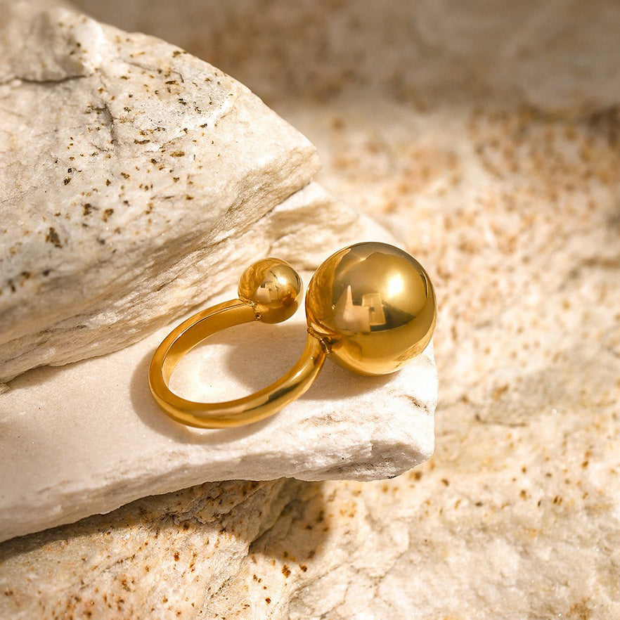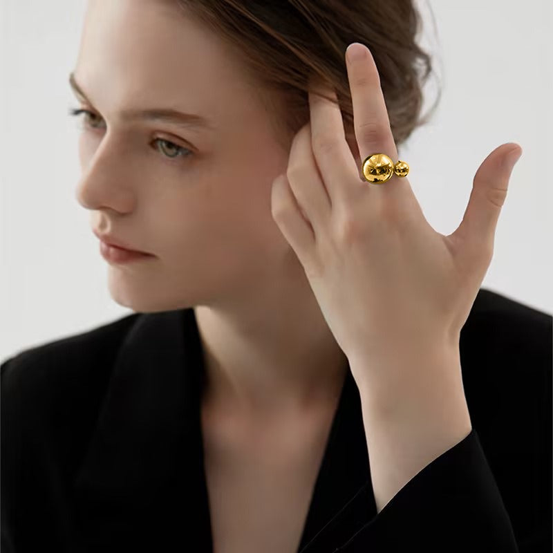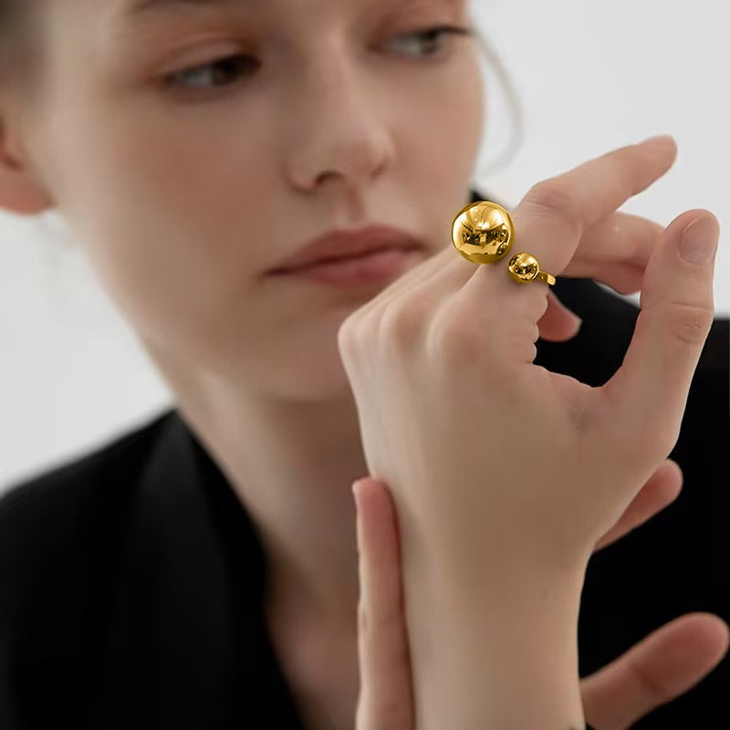 This ring is made of 18K gold and is unique in design. It uses a large and small sphere opening design to show an exaggerated and personalized fashion style. Whether it is worn daily or attended special occasions, this ring can add a unique charm to you and is a highlight of your jewelry.