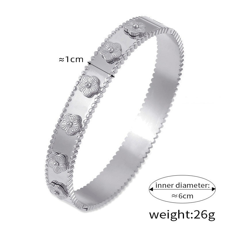 This bracelet is made of high-quality 18K gold, with exquisite flower-shaped inlaid gemstone design, highlighting the nobility and elegance of the light luxury style. The unique flower shape design combined with the gorgeous gemstone inlay makes the bracelet exude charming brilliance, suitable for various occasions to wear, adding to your fashion charm.