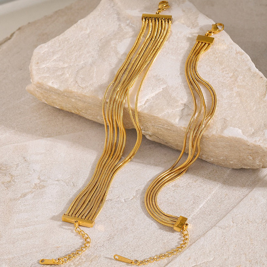 This bracelet, with its unique multi-layer tassel design, shows a smart and elegant style. The delicate layering of the tassels and the noble luster of 18K gold complement each other, adding a touch of fashion and luxury to the bracelet. Whether it is worn daily or attended important occasions, this bracelet can add a unique charm and nobility to your look. As a gift to relatives and friends, or to add a unique fashion taste to yourself, this bracelet is your ideal choice.