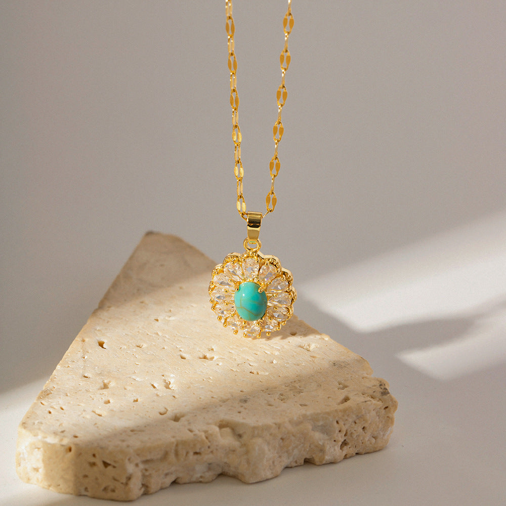 18K Gold Exquisite Dazzling Inlaid White Zircon Songhua Stone Disc Design Versatile Pendant Necklace