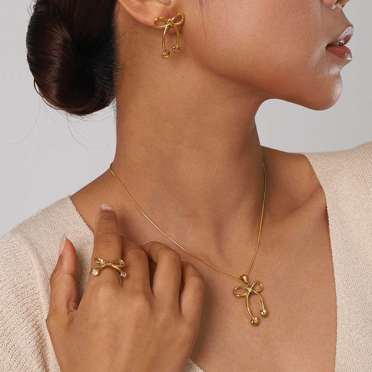 This necklace and earrings set combines modern smooth lines with classic bow design, showing the perfect fusion of elegance and fashion. The 18K gold material gives the set a noble luster and durability, suitable for all occasions. Whether it is daily life or special occasions, this set can add a touch of sophistication and nobility to your look.