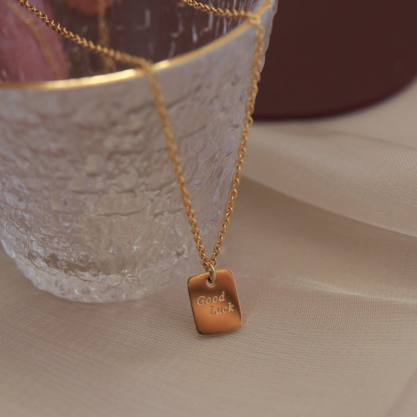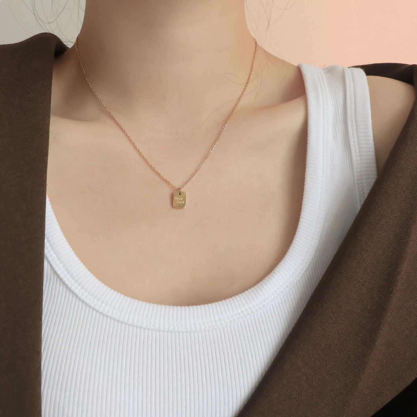 18K gold fashionable and simple square card with "GOOD LUCK" design versatile necklace