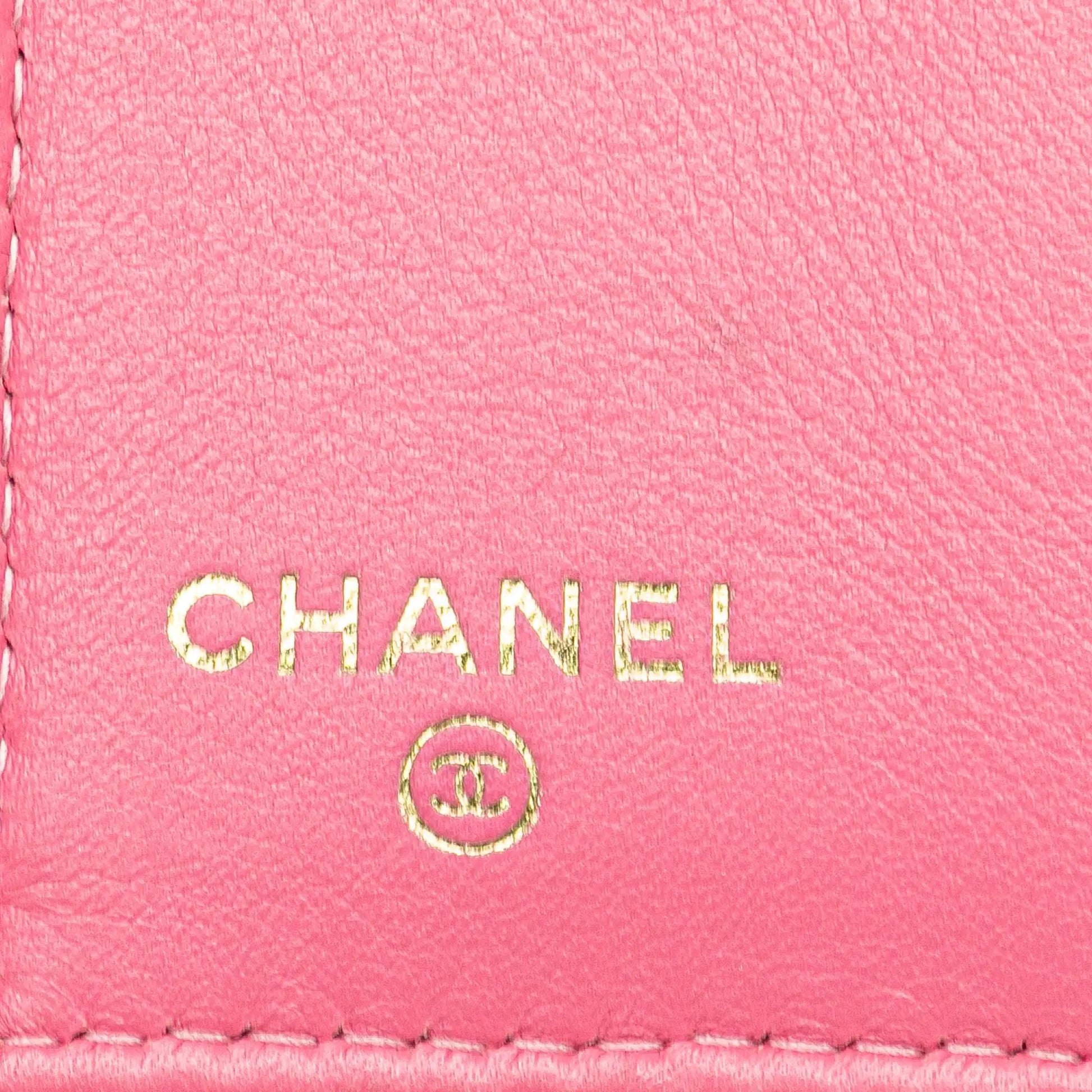 Description | This wallet features a quilted lambskin leather body, a front flap compartment with an interlocking CC logo snap button closure, and interior slip compartments and pockets. |