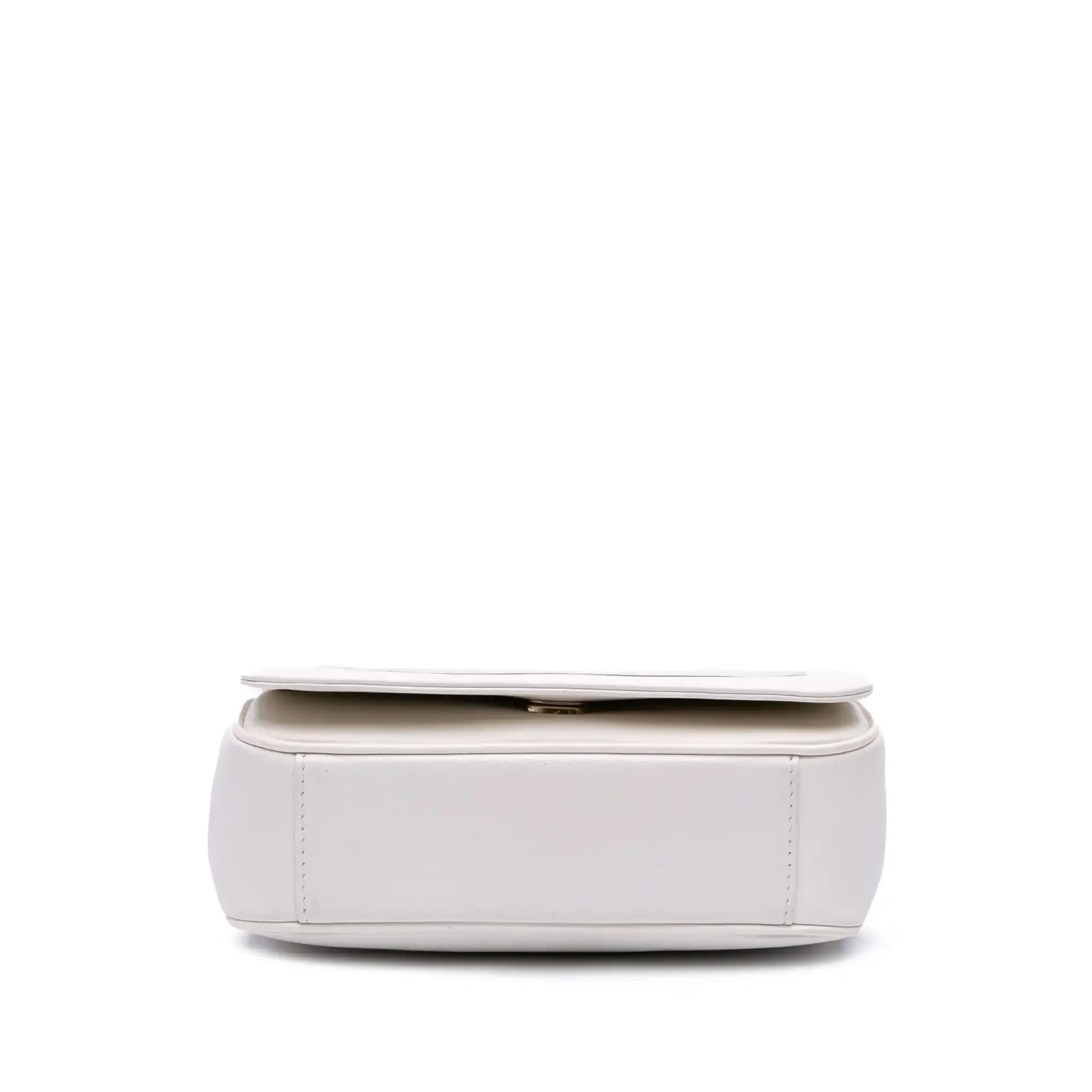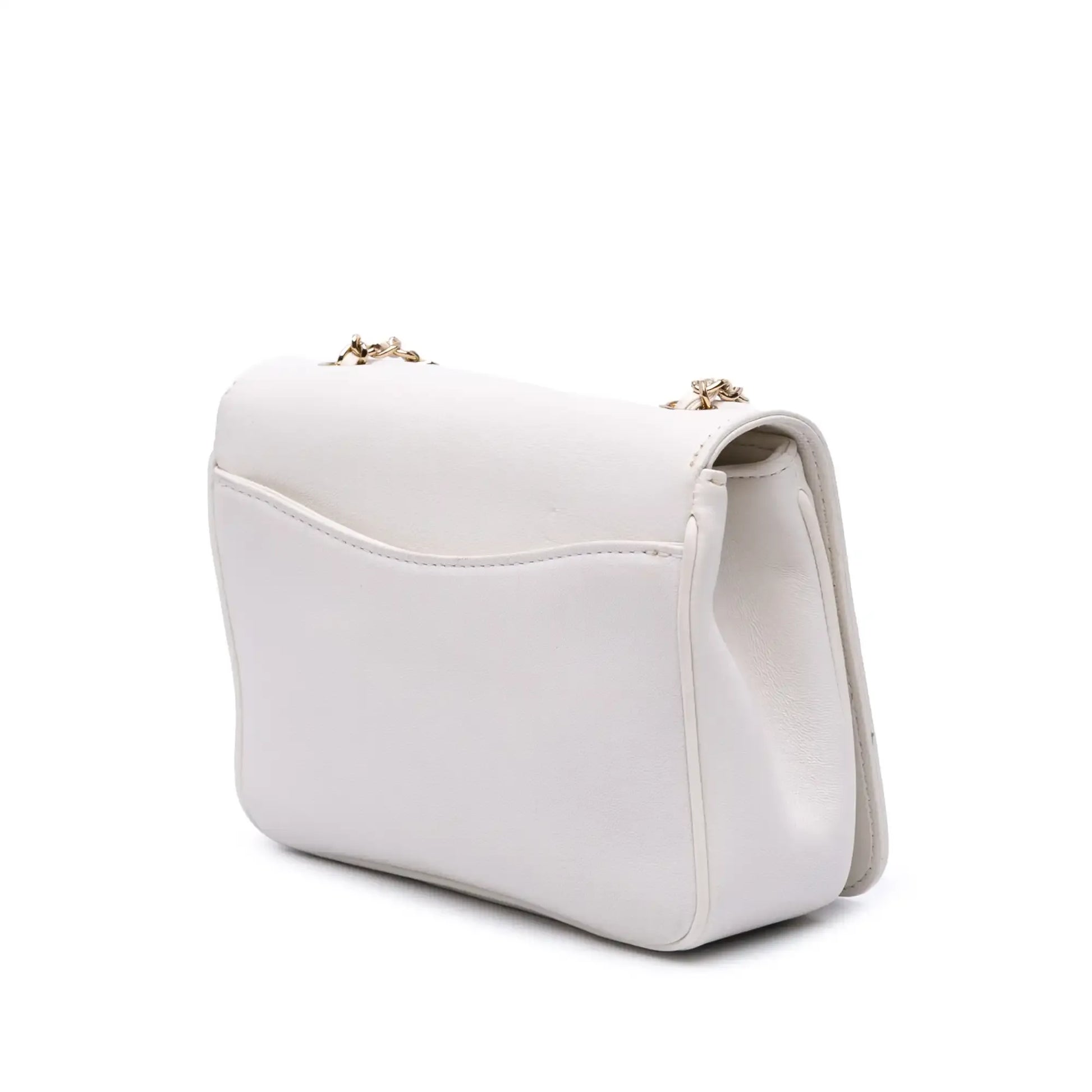 | Description | The Mania flap bag features a lambskin leather body, a leather woven chain strap with leather guard, a front flap with magnetic closure, an exterior back slip pocket, and interior zip pocket. | ||||||||||||