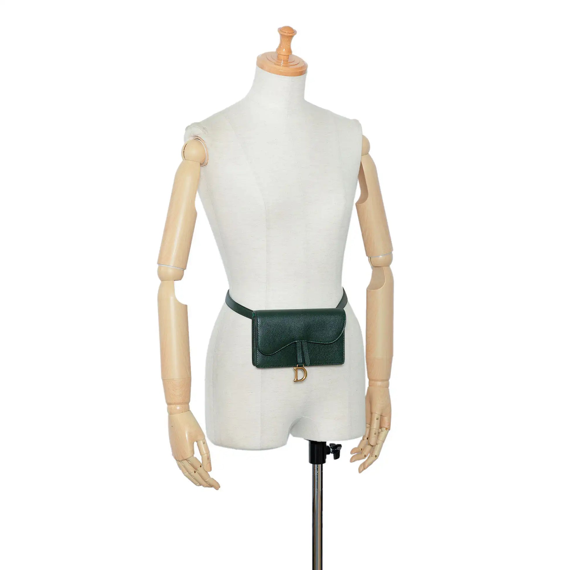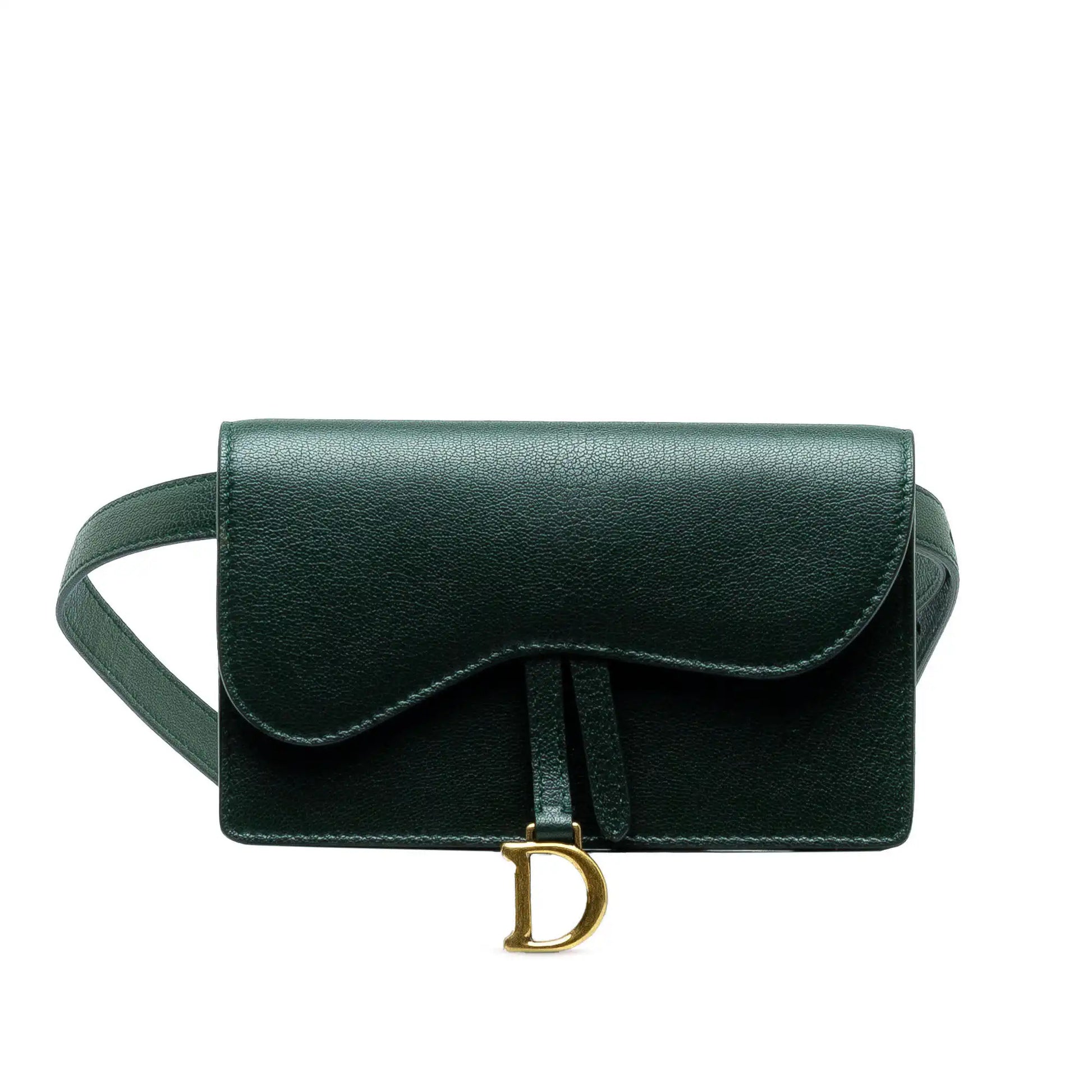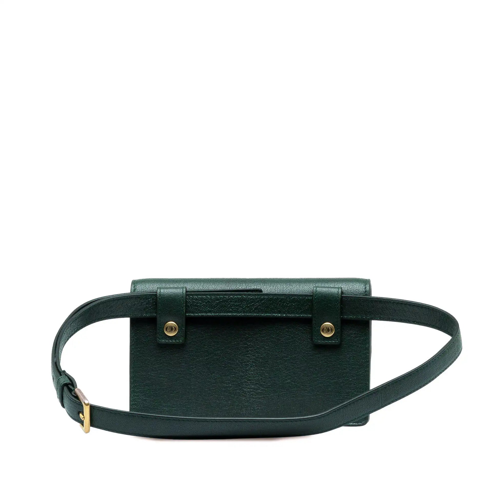 This belt bag features a leather body, an adjustable flat leather waist strap, a front flap with magnetic snap closure, and interior zip and slip pockets. |