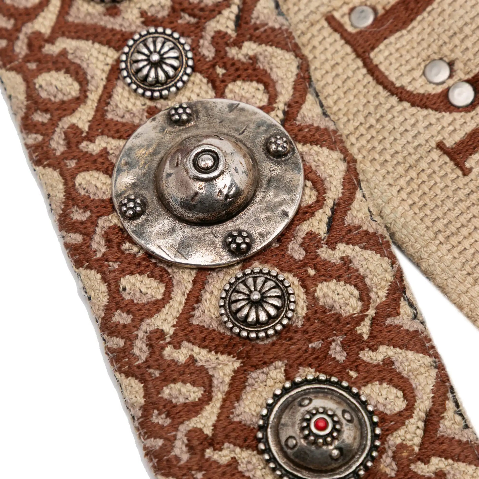 Description | This shoulder strap features a studded canvas body, and metal snap hook attachment. |