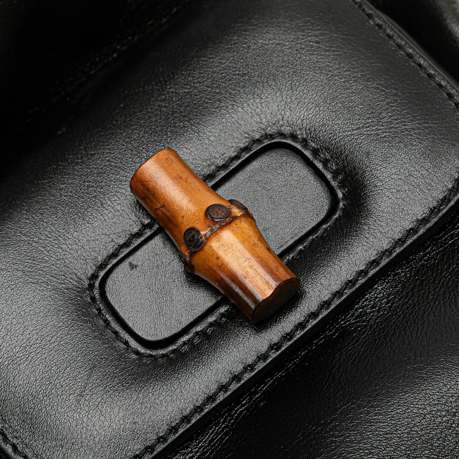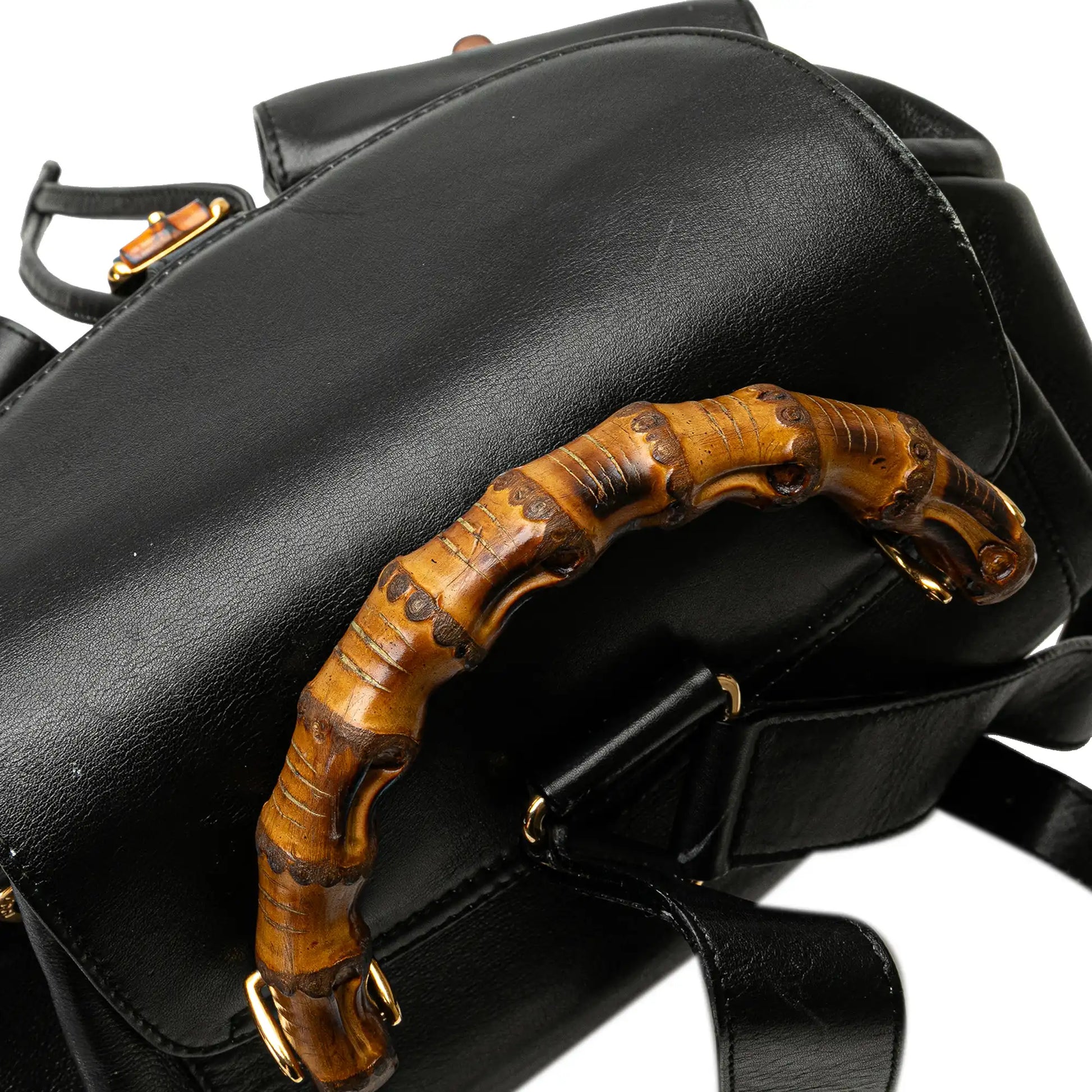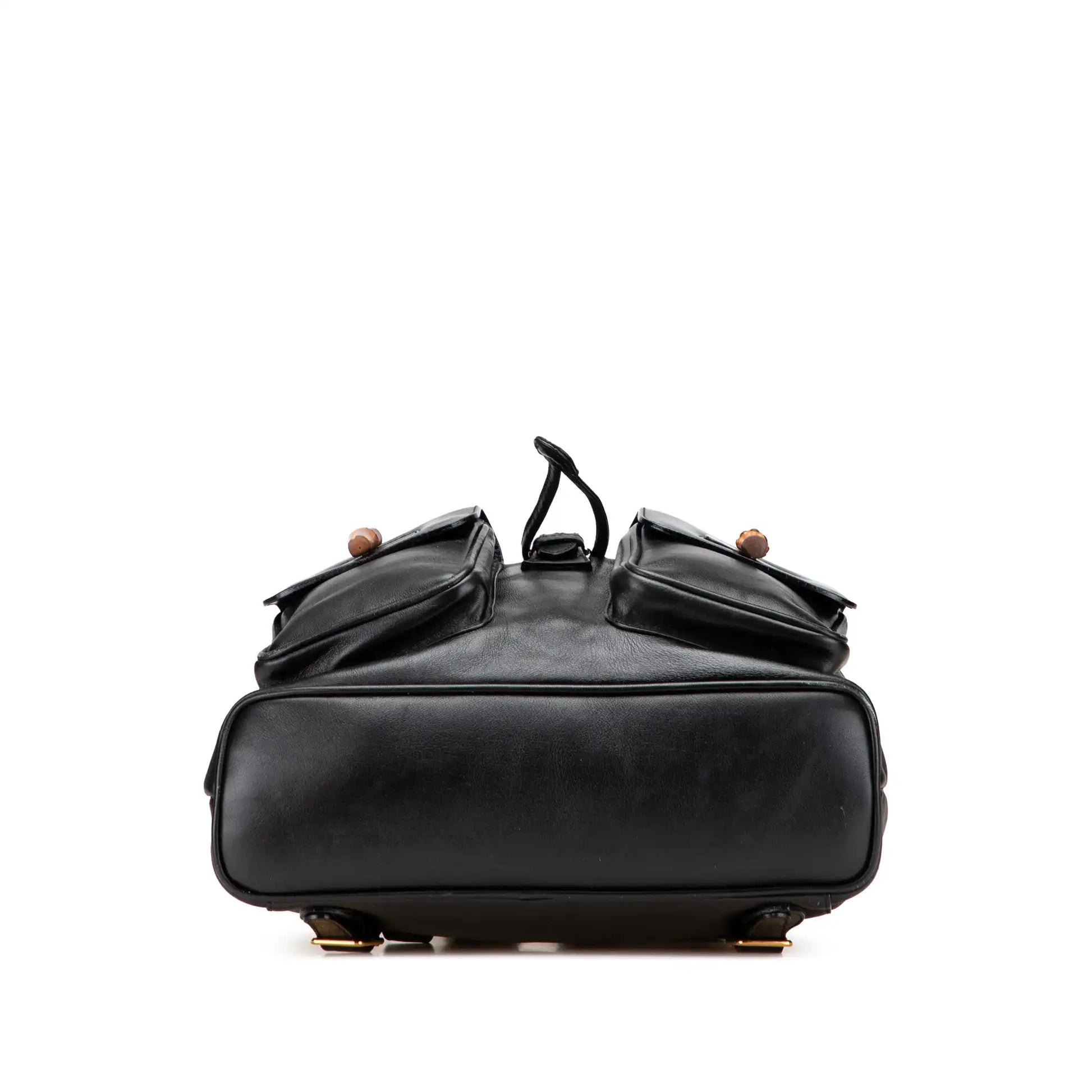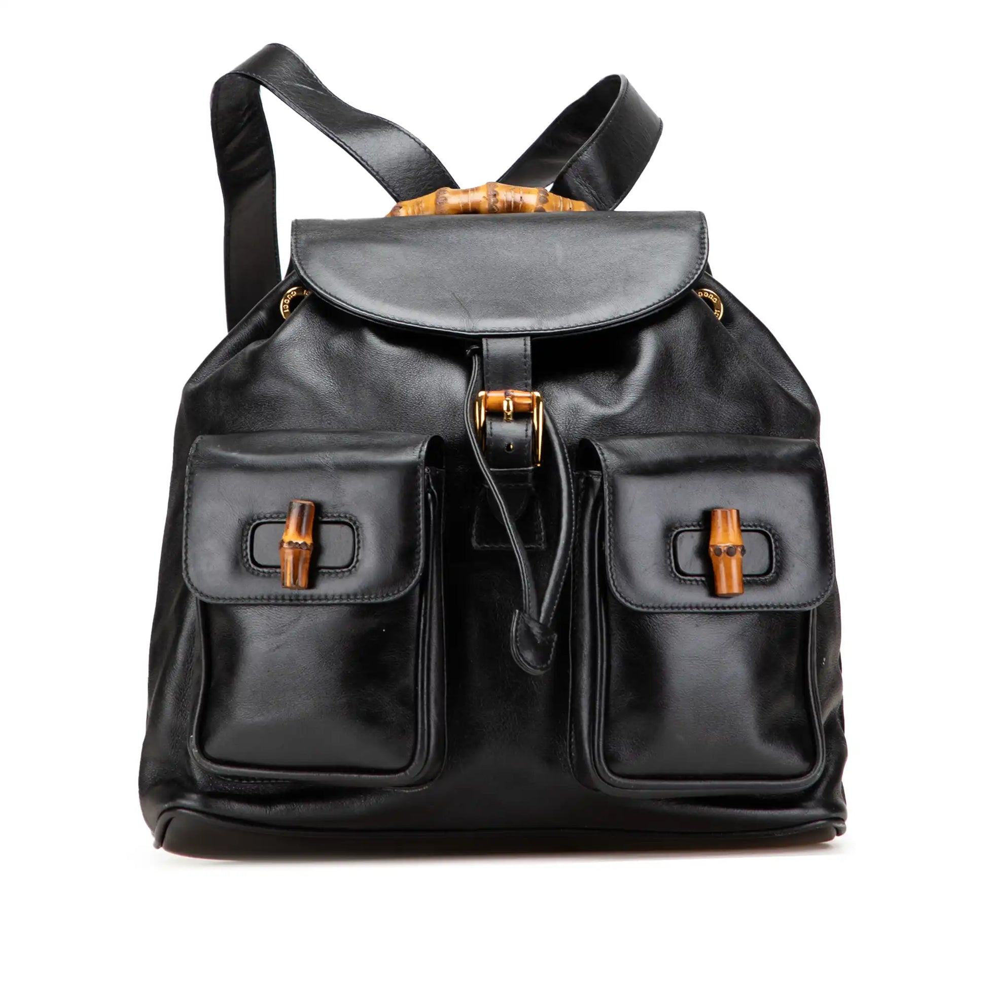 This backpack features a leather body, adjustable flat back straps, a bamboo top handle, a top flap with buckle closure, a drawstring closure, exterior front flap pockets with a bamboo twist lock closure, and an interior zip pocket. |