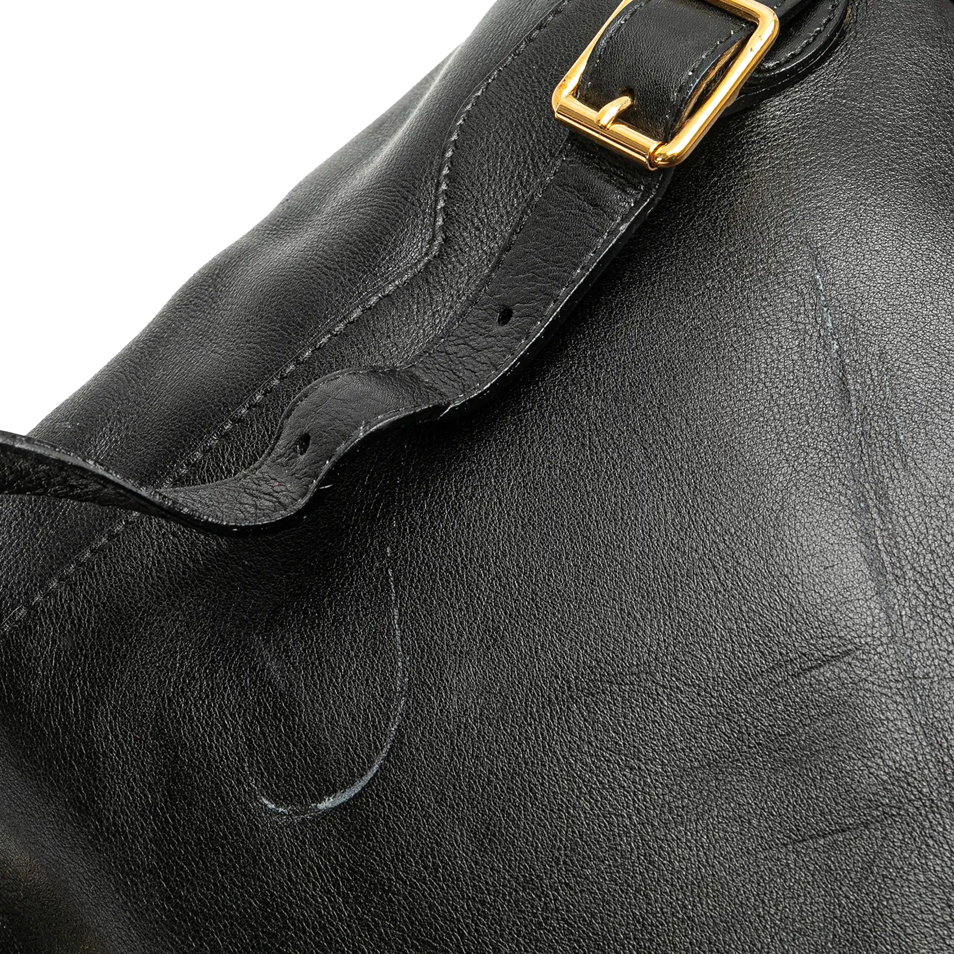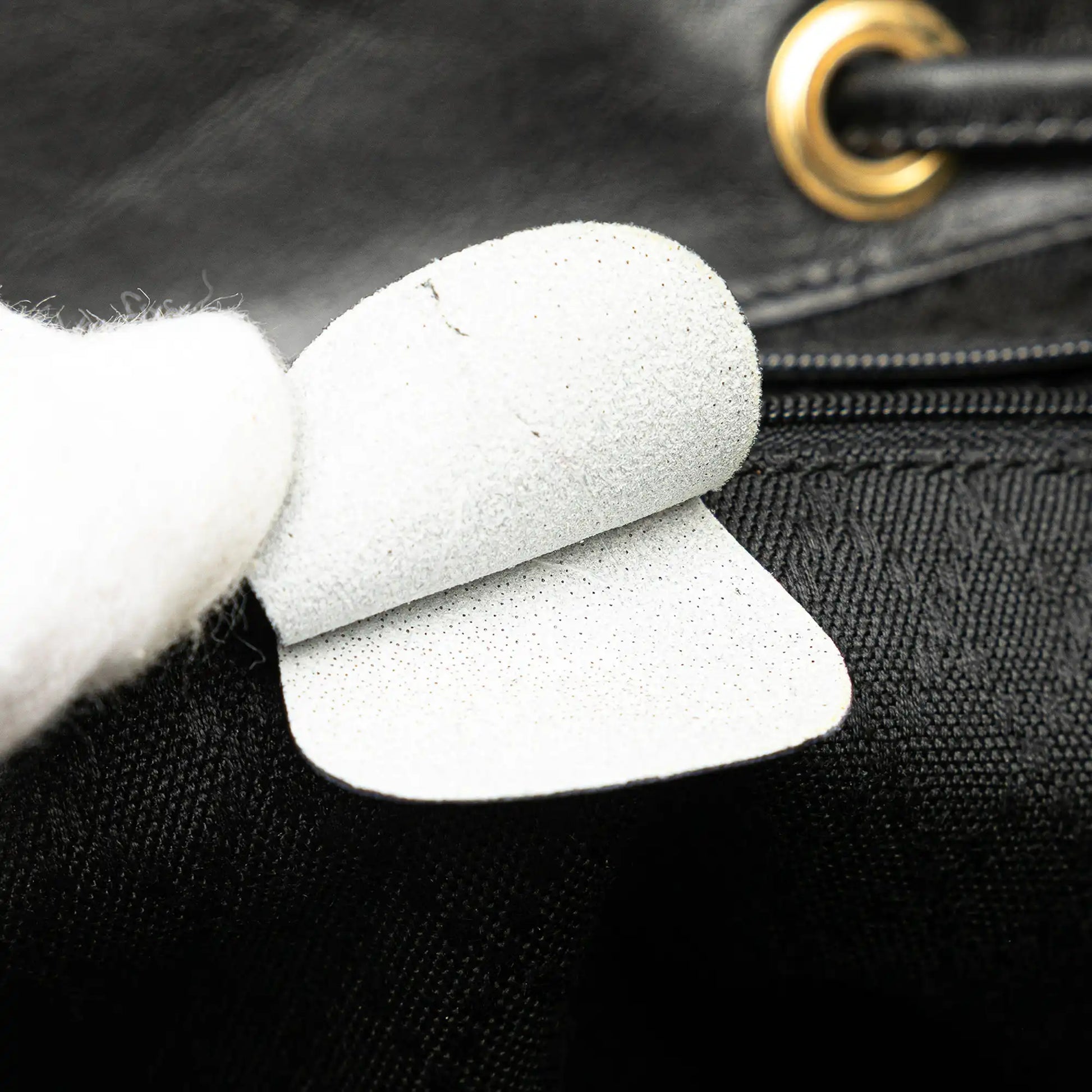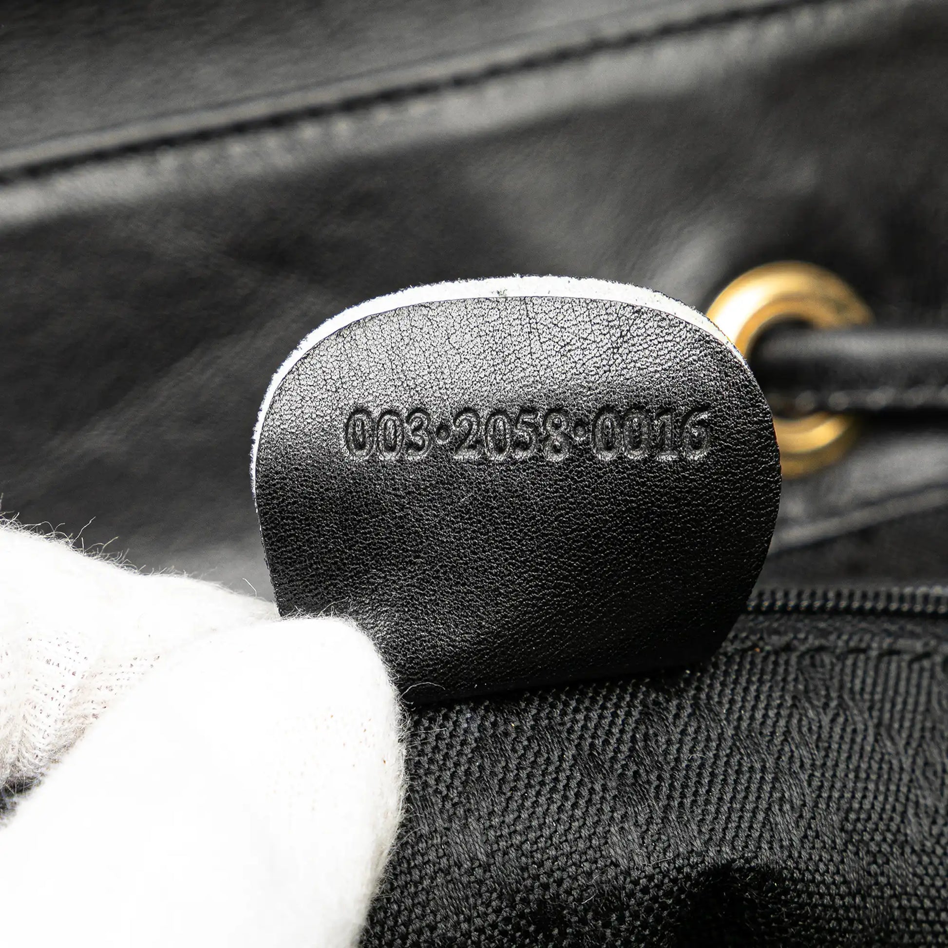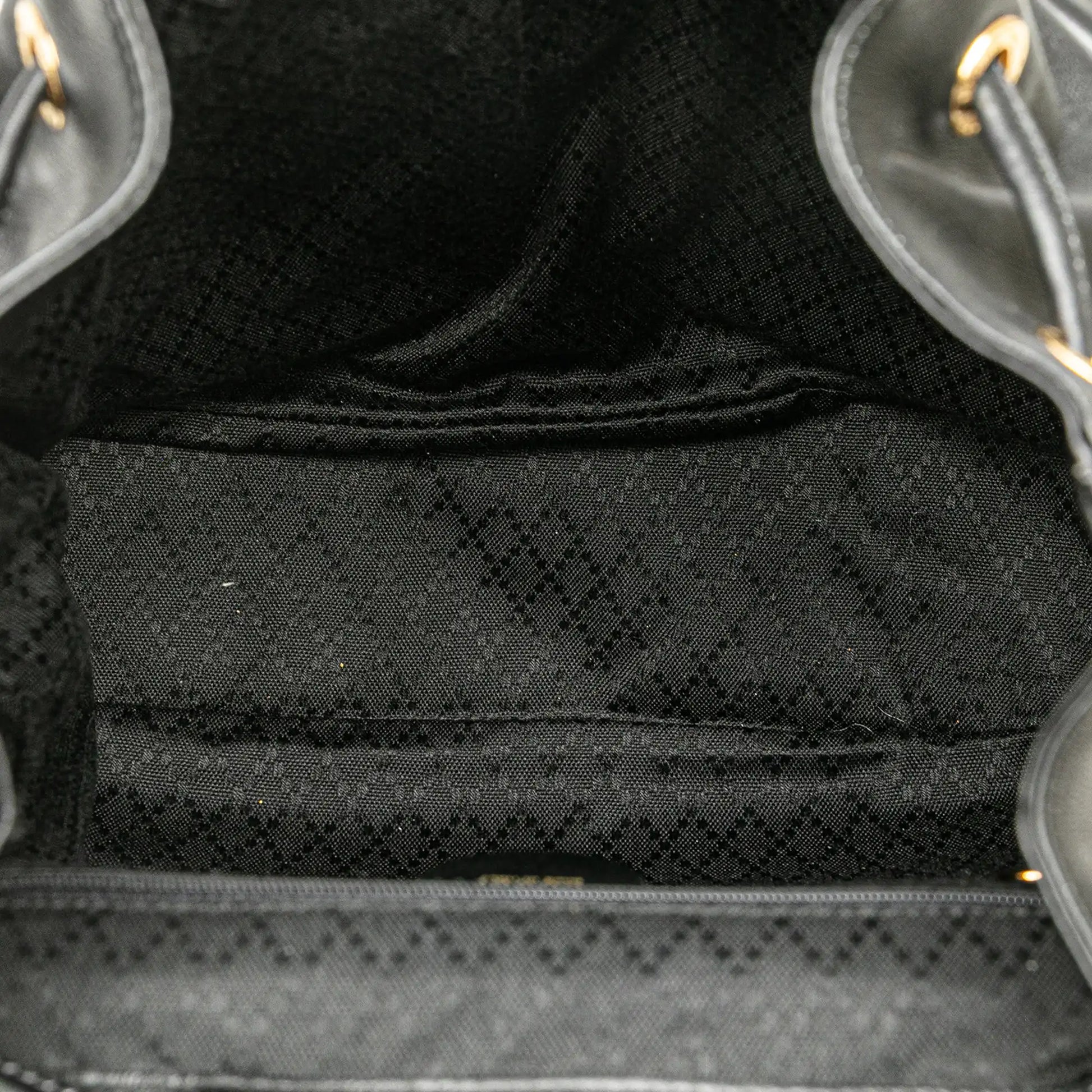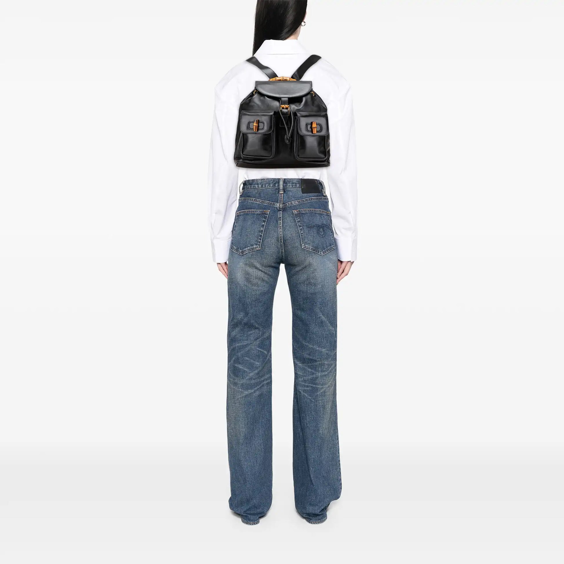 This backpack features a leather body, adjustable flat back straps, a bamboo top handle, a top flap with buckle closure, a drawstring closure, exterior front flap pockets with a bamboo twist lock closure, and an interior zip pocket. |