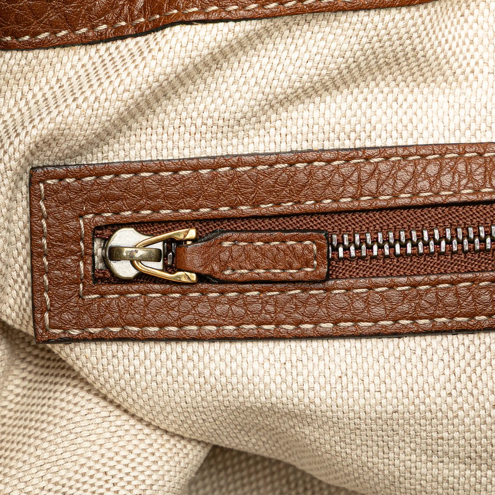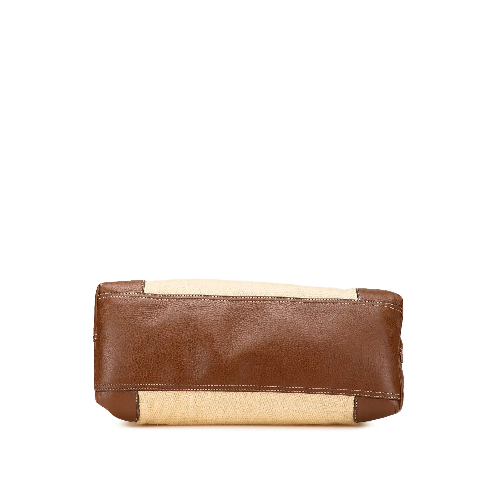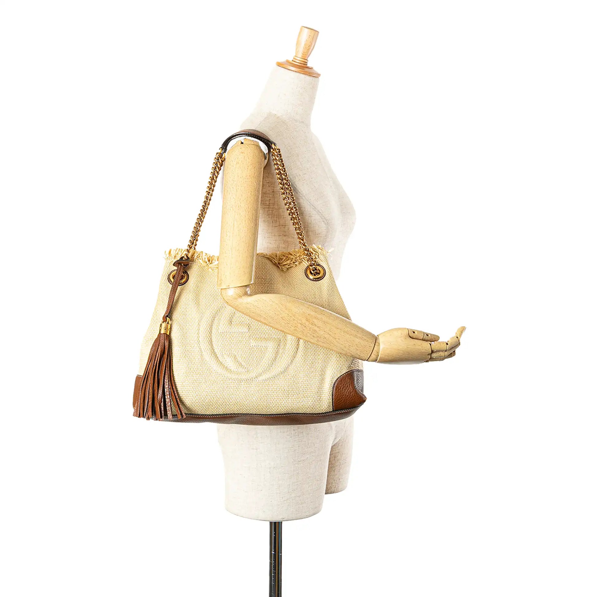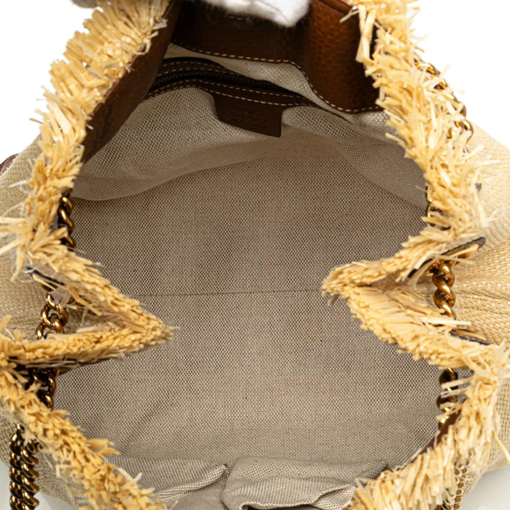 The Soho Chain features a raffia body with leather trim and leather tassel, curb chain link straps with leather guard, an open top with a lobster claw closure, and interior zip and slip pockets.