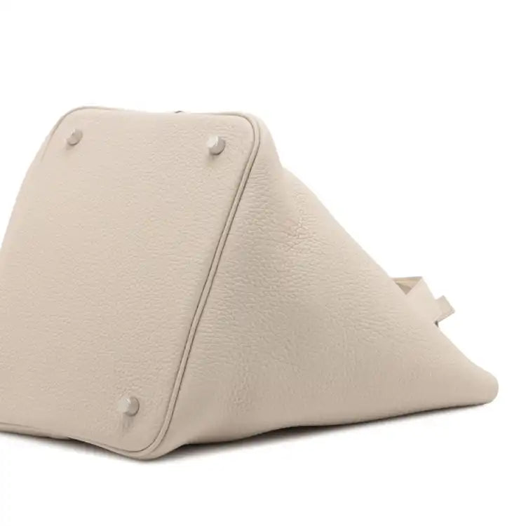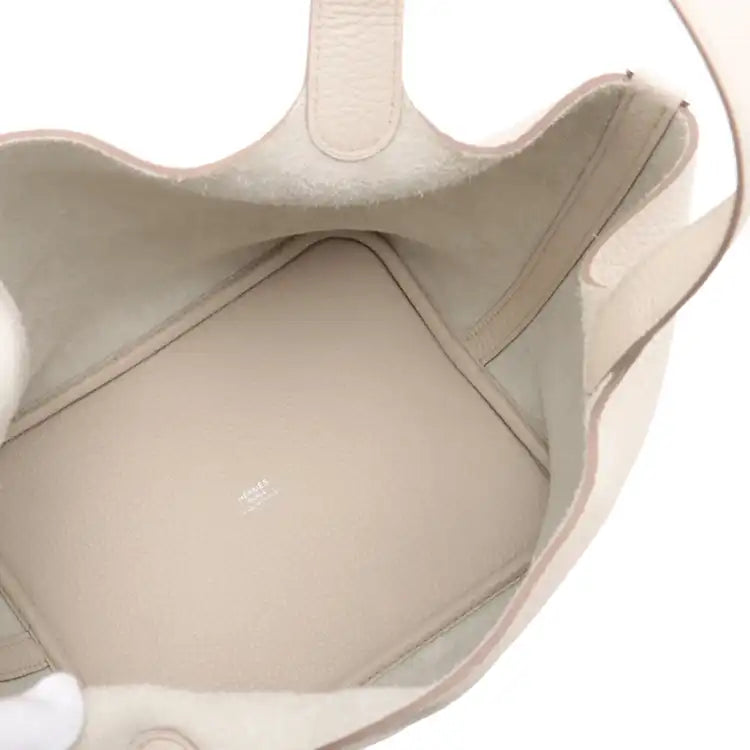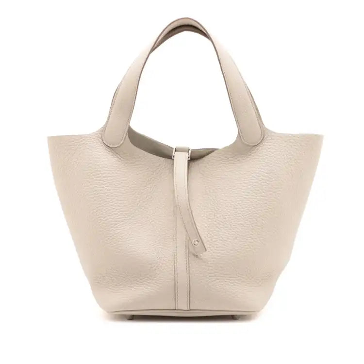 | Description | The Picotin 22 features a clemence leather body in Beton color, flat leather handles, and an open top with flat strap with padlock. | ||||||||||||