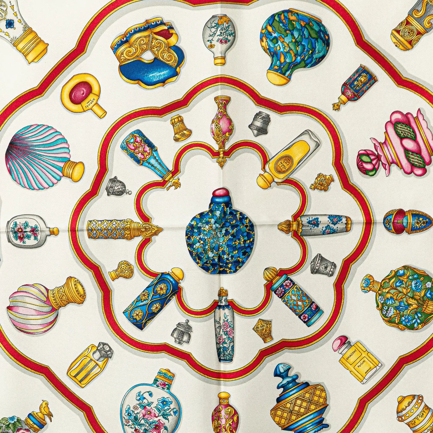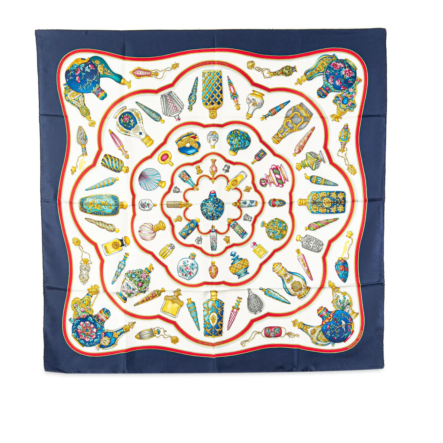 The Qu Importe Le Flacon scarf features a print on 100% silk.