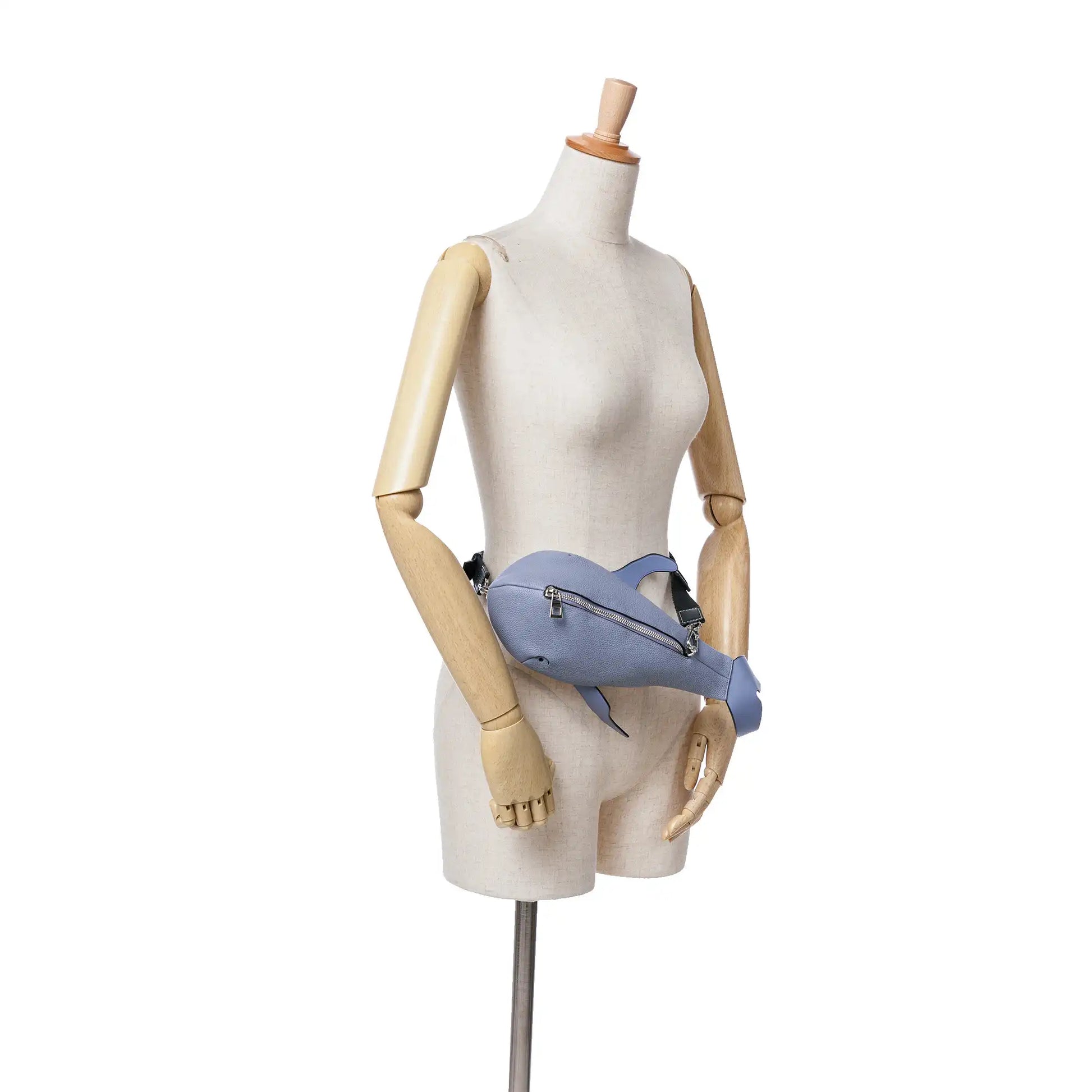This belt bag features a leather body, detachable flat waist strap with buckle closure, and a top zip closure. |