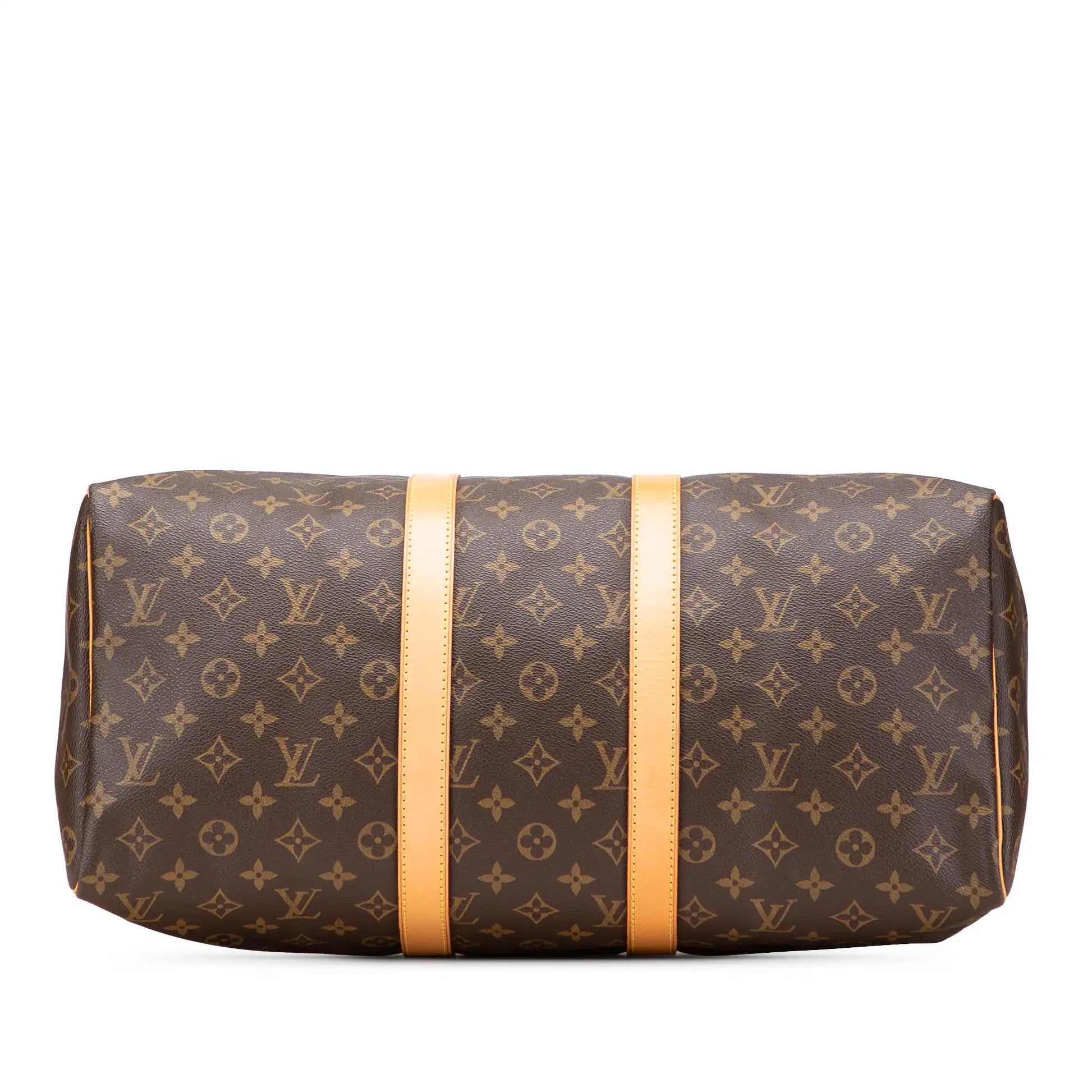 The Keepall 45 features a monogram canvas body with vachetta leather trim, rolled vachetta leather handles, and a top zip closure.