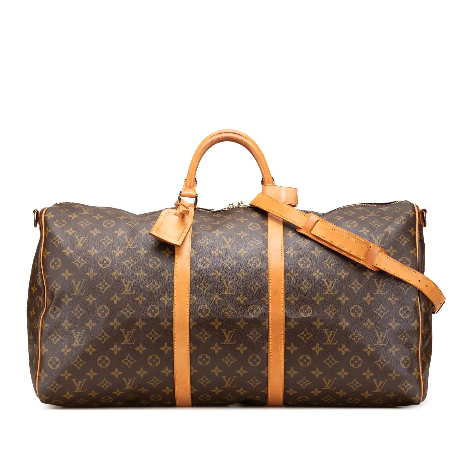 The Keepall Bandouliere 60 features a monogram canvas body with vachetta leather trim, rolled vachetta leather handles, a detachable flat vachetta leather shoulder strap, and a top zip closure. |