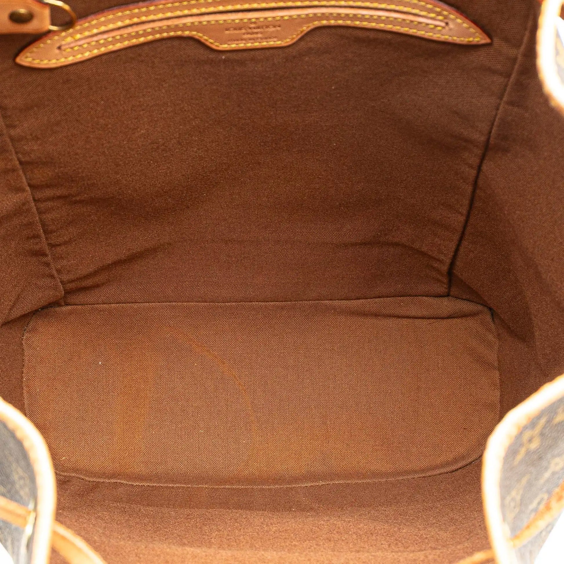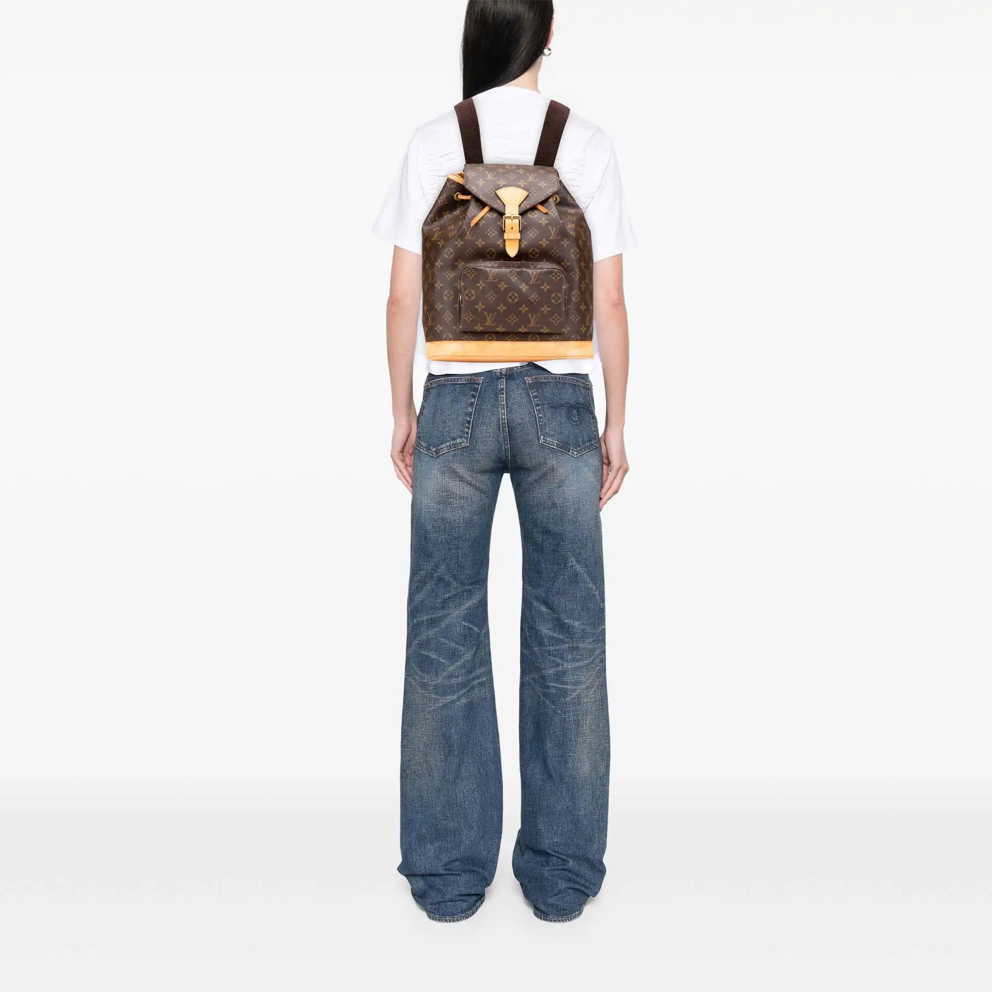 The Montsouris GM features a monogram canvas body with vachetta leather trim, adjustable flat back straps, a flap with belt buckle detail, a top drawstring closure, an exterior front zip pocket, and an interior slip pocket. |