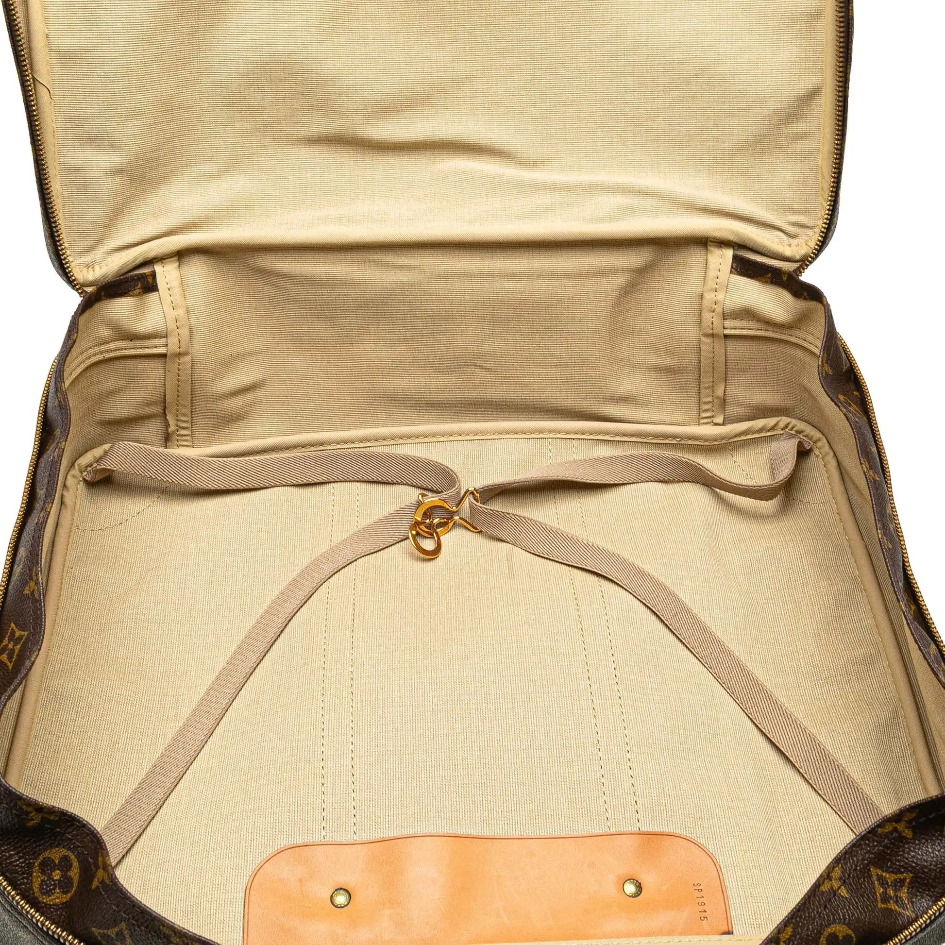The Sirius 45 features a monogram canvas body with leather trim, rolled leather handles, a zip-around closure, and an interior slip compartment. |