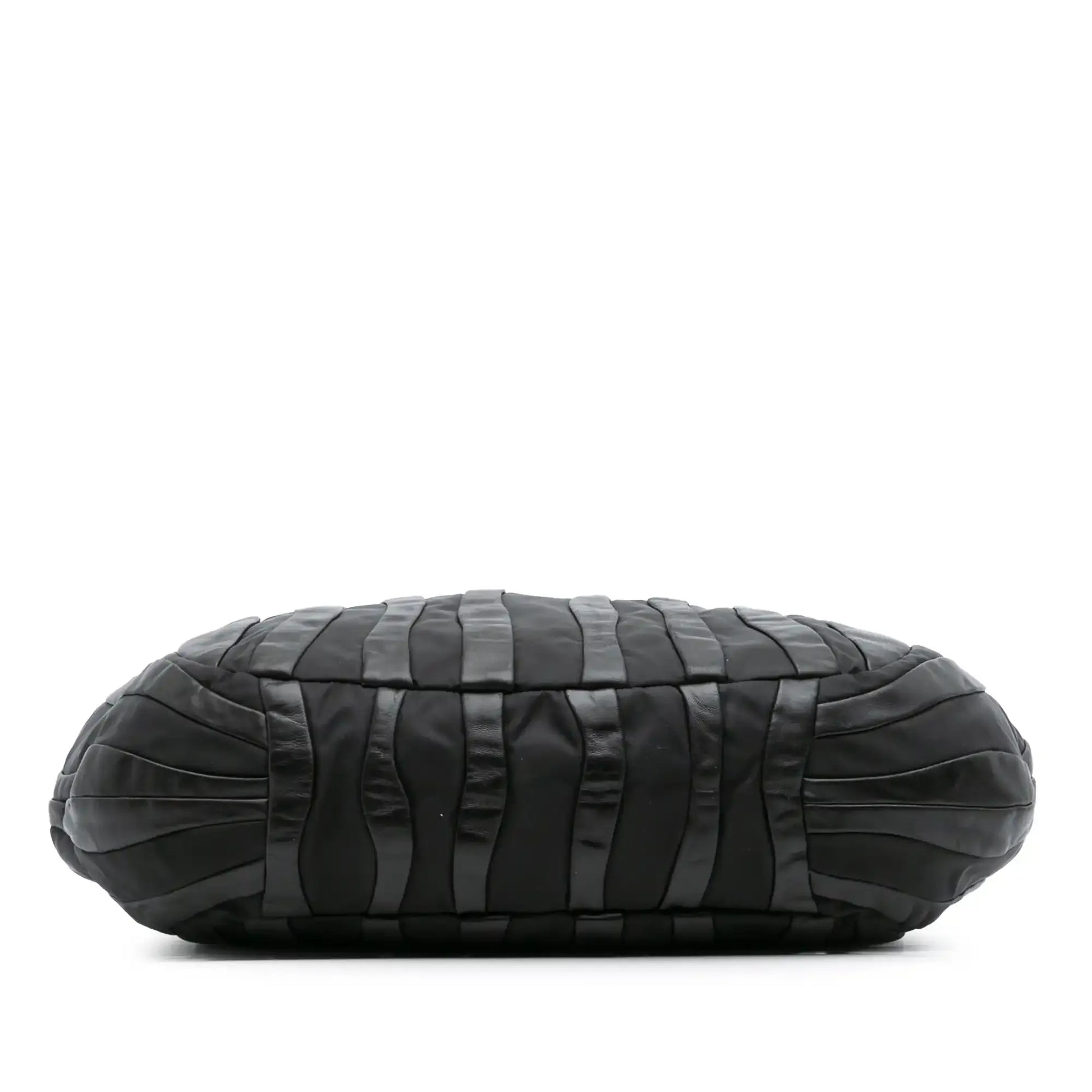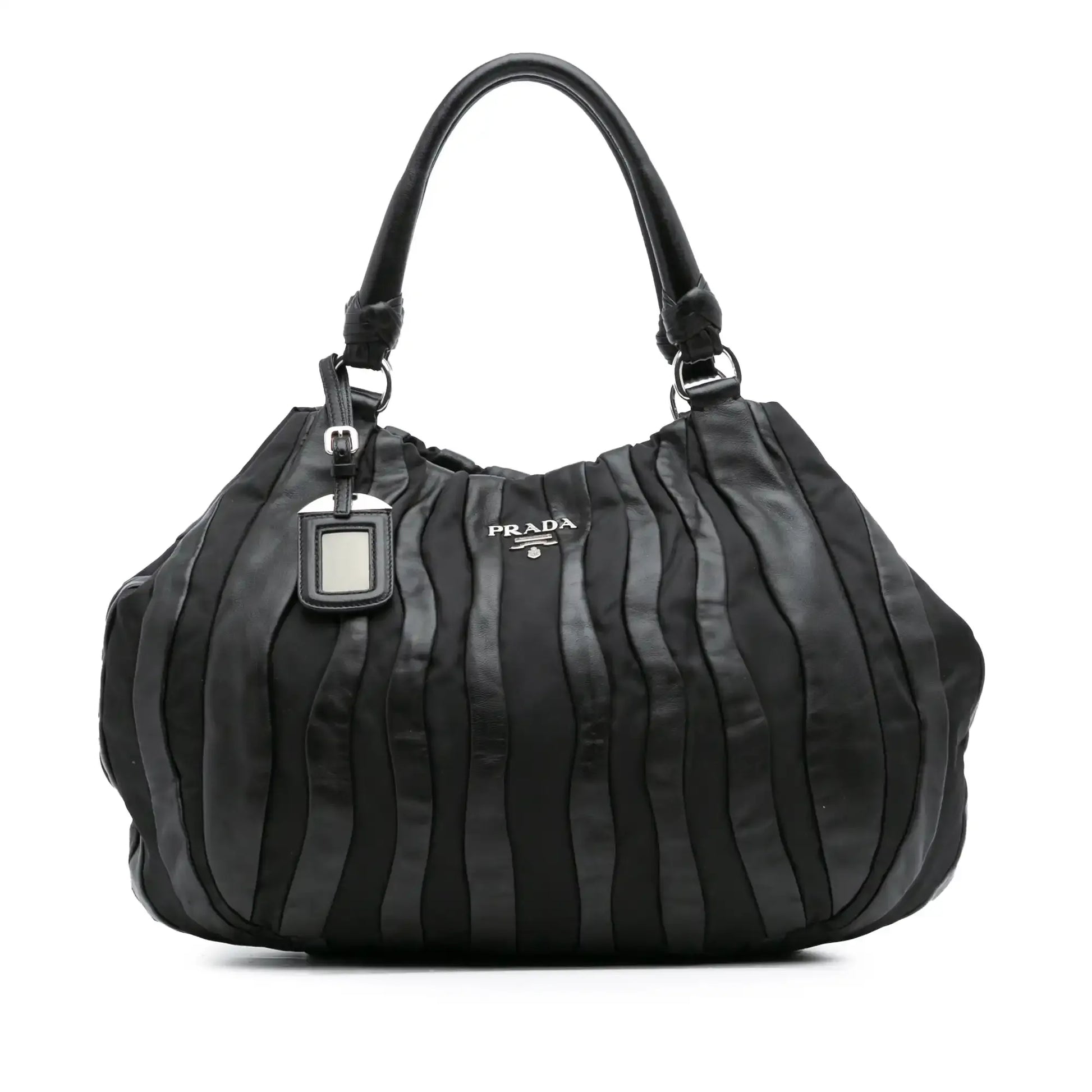 Description | This tote bag features a nylon and nappa leather body, rolled leather handles, an open top with magnetic closure, and interior zip and slip pockets. | ||||||||||||