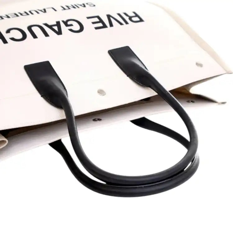 Description | This tote bag features a canvas body, rolled leather handles, an open top with snap button closure, and an interior zip pocket. | ||||||||||||